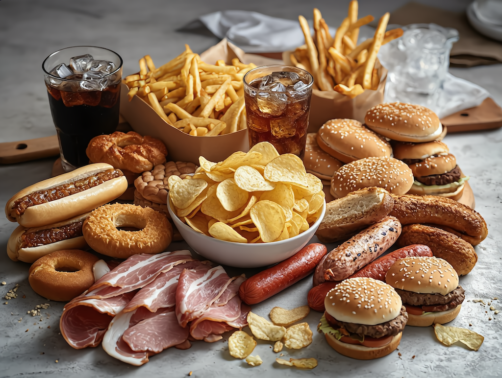 Ультраобработанные мясные продукты такие как сосиски, сардельки, колбасы, бекон, готовые мясные нарезки, содержат много соли, нитраты и нитриты (даже канцерогены при определённых условиях), насыщенные жиры, усилители вкуса и другие консерванты.
